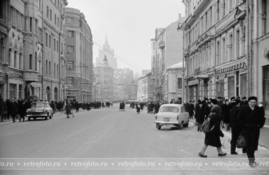 Ул. Арбат в сторону Садового кольца. Первый справа дом (виден его фрагмент) - № 4. Снято в марте 1966 года. Фотограф Зилов Алексей Львович. Узкая пленка, кадр 24х36 мм.